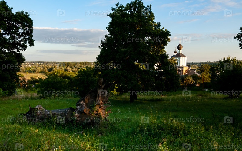 Вековые дубы в Рыльском Никольском монастыре. Видна Троицкая церковь. Курская область Рыльск