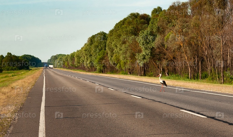 Аист ходит по оживленному шоссе, выискивая, чем бы поживиться на обочине. Курская область, Россия