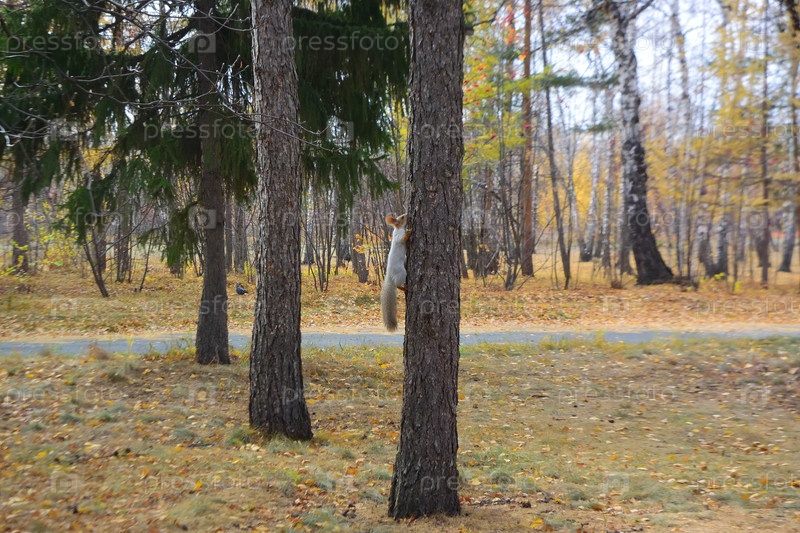 Белка на дереве в осеннем парке в городе Омске