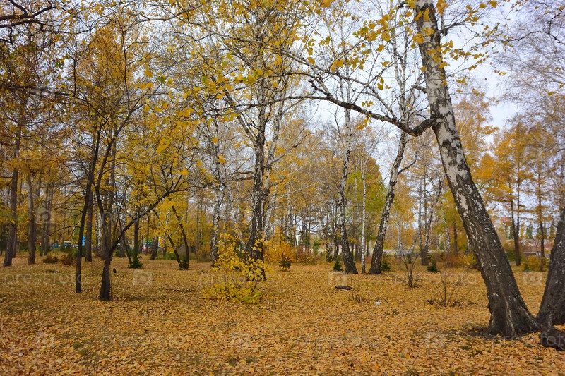 Желтые деревья в осеннем парке в городе Омске