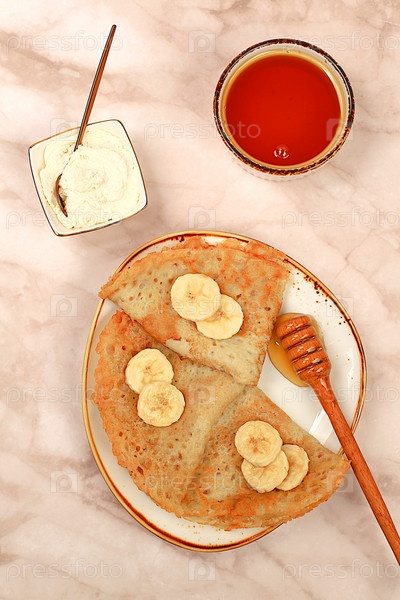 Вкусные русские блины с мягким сыром, бананами и медом на мраморном столе. Здоровый завтрак с ингредиентами, концепцией карнавала и традиционной национальной кухней, избирательным фокусом