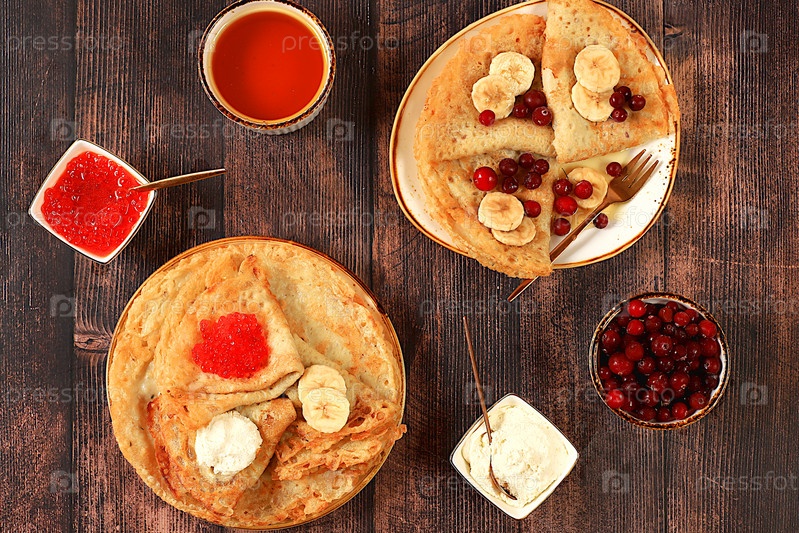 Вкусные русские блины с красной икрой, мягким творогом, бананами, клюквой и медом на деревянном столе. Здоровый завтрак с ингредиентами, концепцией карнавала и традиционной национальной кухней,