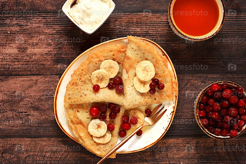 Вкусные русские блины с мягким творогом, бананами, клюквой и медом на деревянном столе. Здоровый завтрак с ингредиентами, концепцией карнавала и традиционной национальной кухней, избирательным фокусом
