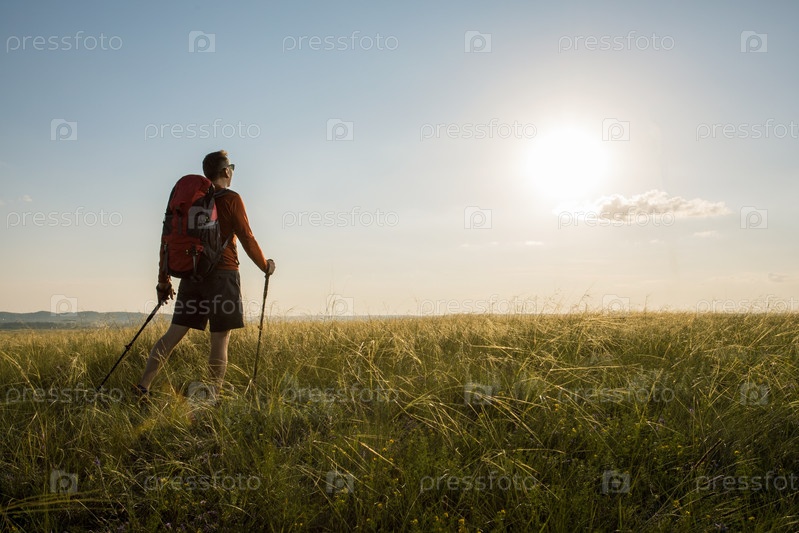 Мужчина в походе на закате. Путешествие образ жизни страсть к путешествиям концепция приключений летние каникулы на открытом воздухе
