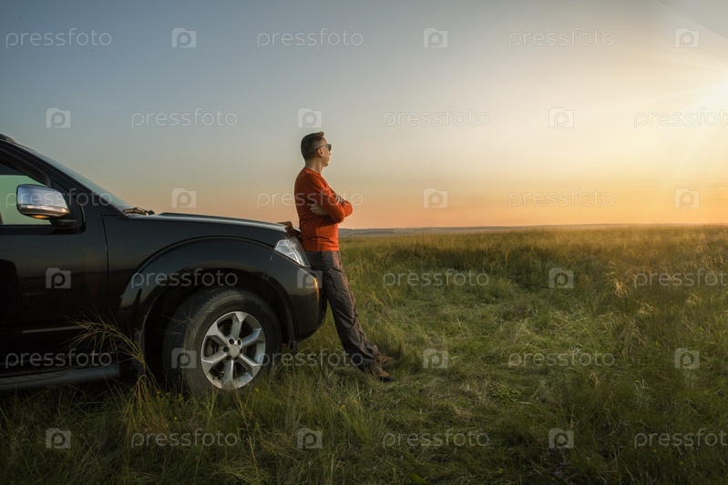 Мужчина наслаждается вечером, путешествуя на автомобиле на закате. концепция туристических путешествий и мужского одиночества. человек думает о природе