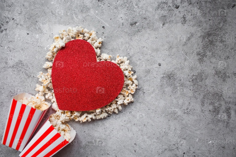 Баннер для киноиндустрии. Романтическое свидание в кино. Сердце из попкорна и полосатые чашки в стиле ретро на стильном бетонно-сером фоне. Премьера фильма состоится в День святого Валентина