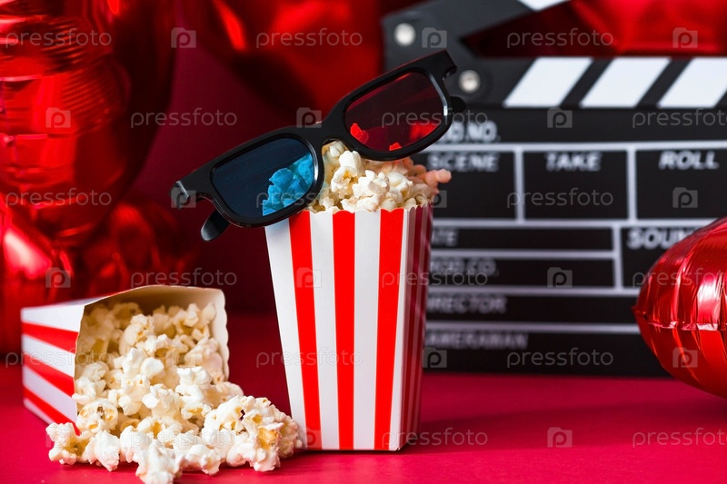 Баннер для киноиндустрии. Романтическое свидание в кино. Кинокамера, 3D-очки, попкорн и фольгированные шары в форме сердца на красном фоне. Премьера фильма состоится в День святого Валентина
