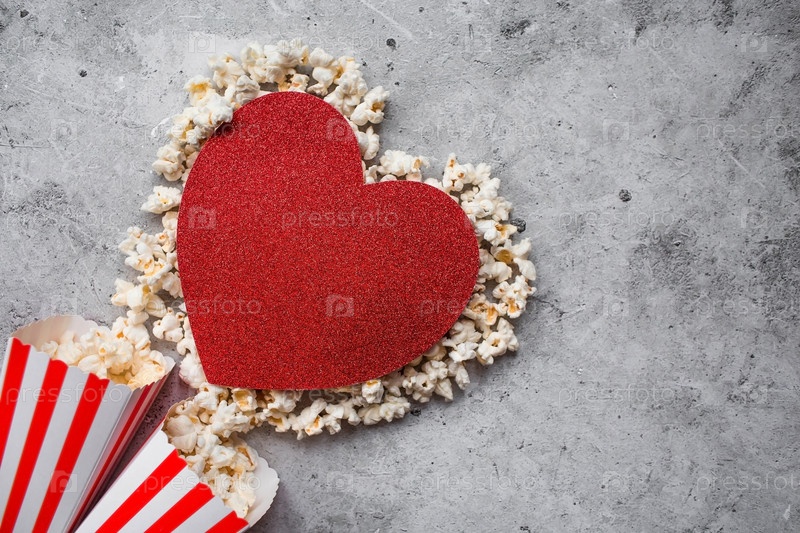 Баннер для киноиндустрии. Романтическое свидание в кино. Сердце из попкорна и полосатые чашки в стиле ретро на стильном бетонно-сером фоне. Премьера фильма состоится в День святого Валентина