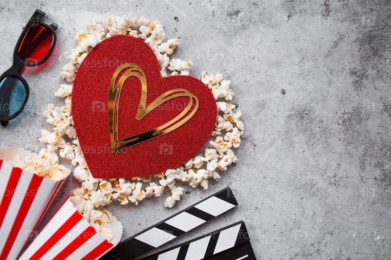 Баннер для киноиндустрии. Романтическое свидание в кино. Кинокамера, 3D-очки, попкорн и сердце из попкорна на стильном бетонно-сером фоне. Премьера фильма состоится в День святого Валентина