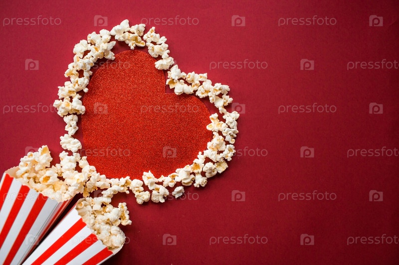 Баннер для киноиндустрии. Романтическое свидание в кино. Сердце попкорна и полосатые чашки в стиле ретро на красном фоне. Премьера фильма состоится в День святого Валентина