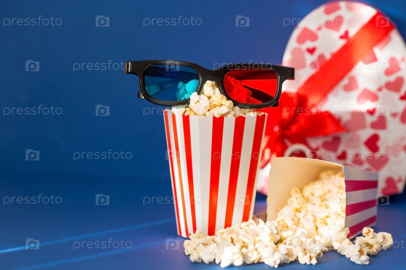 Баннер для киноиндустрии. Романтическое свидание в кино. Кинокамера, 3D-очки, попкорн и красные сердца на синем фоне. Премьера фильма состоится в День святого Валентина