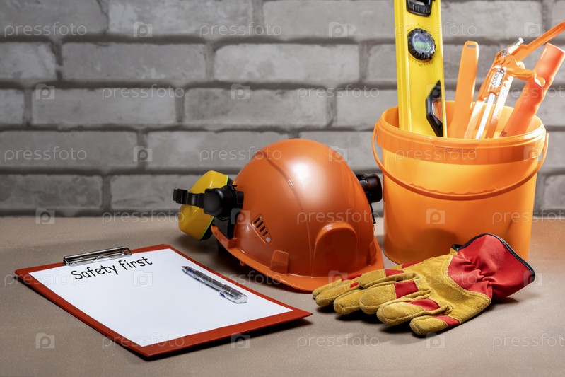 Защитное оборудование, инструменты и контрольный список с текстом «БЕЗОПАСНОСТЬ ПЕРВЫМ». безопасность прежде всего, концепция строительства