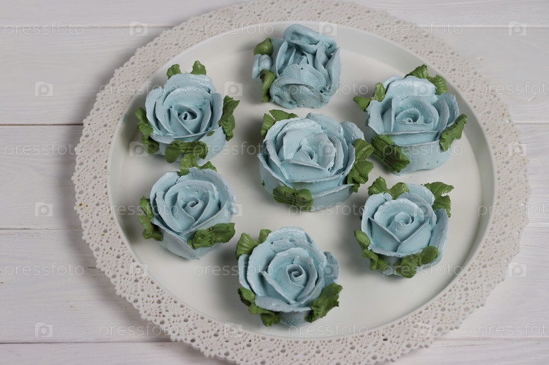 Домашний зефир разложен на подносе. Цветы из зефира. Крупный план
