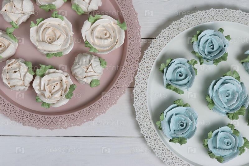 Домашний зефир разложен на подносе. Цветы из зефира. Крупный план