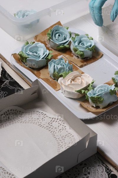 Домашний зефир разложен на подносе. Цветы из зефира. Крупный план