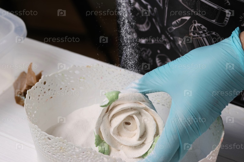 Женщина посыпает домашний зефир сахарной пудрой. Цветы из зефира. Предприниматель за работой. Домашний зефир