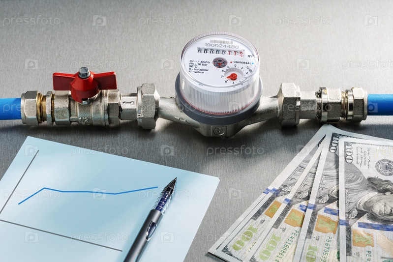 Счетчик воды и банкноты в долларах США. Концепция роста потребления воды, цен и затрат