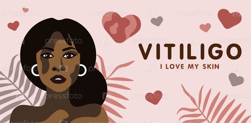 Баннер о кожном заболевании витилинго с молодой красивой женщиной-мулаткой, минималистичная векторная иллюстрация, текст "Я люблю свою кожу"