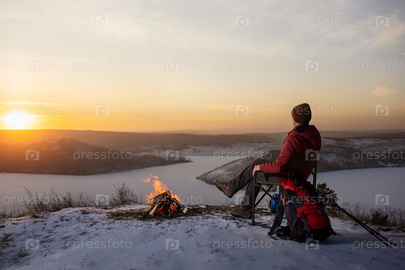 Мужчина-путешественник сидит на вершине горы возле костра и наслаждается желтым закатом на зимней природе. Путешествия, образ жизни, концепция свободы
