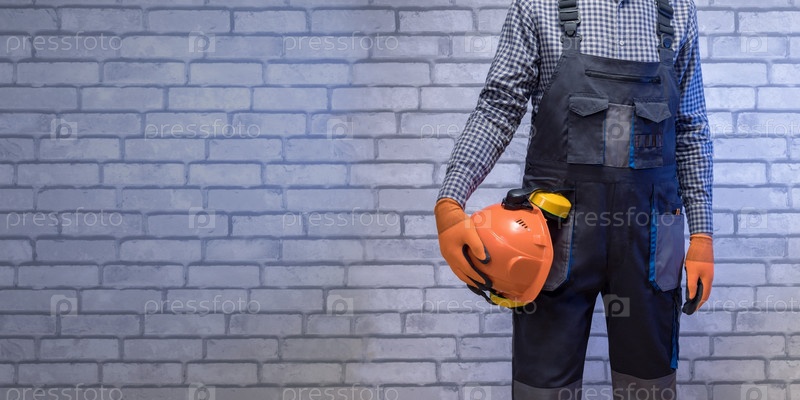 Мужчина-строитель держит защитный шлем или каску. мужчина-строитель в защитном костюме стоит на фоне кирпичной стены. баннер с местом для копирования