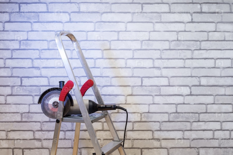 Металлическая лестница и угловая шлифовальная машина на фоне кирпичной стены с копировальным пространством. Строительный фон