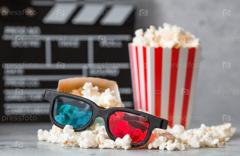 Баннер для киноиндустрии. свидание в кино. кинокамера, 3D-очки, попкорн в полосатых чашках на стильном бетонно-сером фоне. премьера фильма