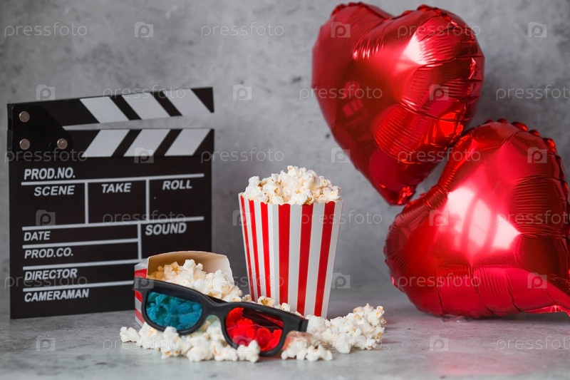 Баннер для киноиндустрии. Романтическое свидание в кино. Кинокамера, 3D-очки, попкорн и фольгированные шары в форме сердечек на бетонно-сером фоне. Премьера фильма состоится в День святого Валентина