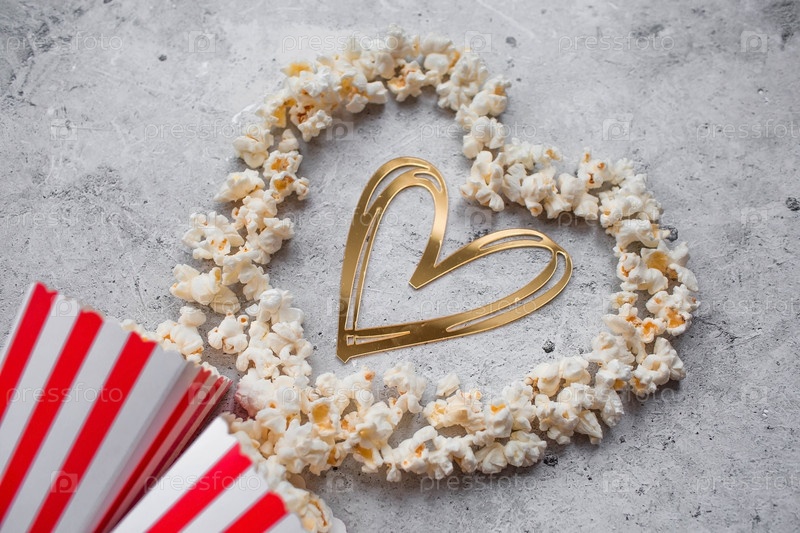 Баннер для киноиндустрии. Романтическое свидание в кино. Сердце из попкорна и полосатые чашки в стиле ретро на стильном бетонно-сером фоне. Премьера фильма состоится в День святого Валентина
