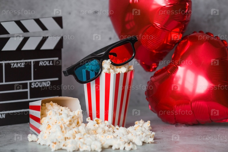 Баннер для киноиндустрии. Романтическое свидание в кино. Кинокамера, 3D-очки, попкорн и фольгированные шары в форме сердечек на бетонно-сером фоне. Премьера фильма состоится в День святого Валентина