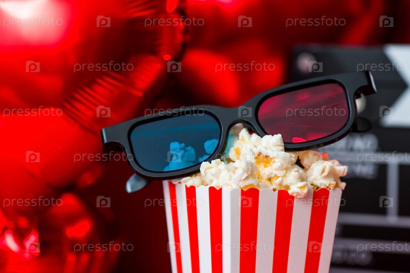 Баннер для киноиндустрии. Романтическое свидание в кино. Кинокамера, 3D-очки, попкорн и фольгированные шары в форме сердца на красном фоне. Премьера фильма состоится в День святого Валентина