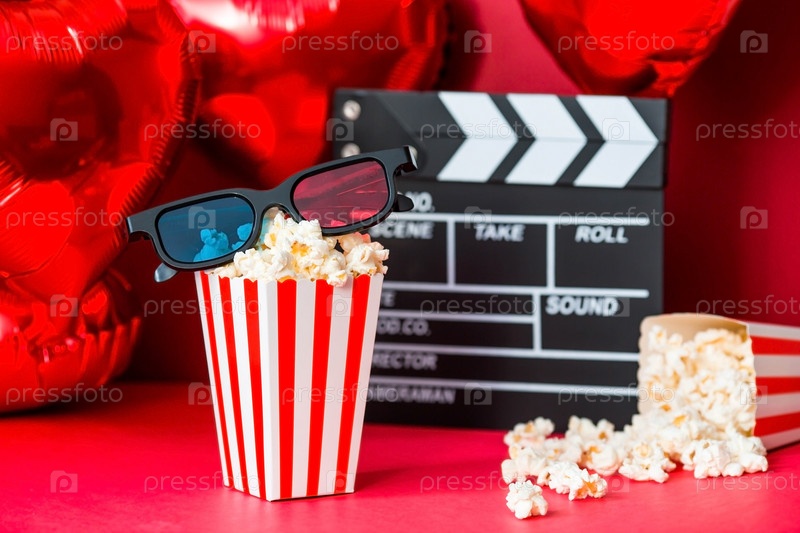 Баннер для киноиндустрии. Романтическое свидание в кино. Кинокамера, 3D-очки, попкорн и фольгированные шары в форме сердца на красном фоне. Премьера фильма состоится в День святого Валентина