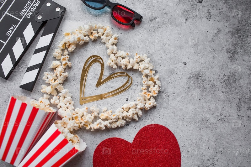 Баннер для киноиндустрии. Романтическое свидание в кино. Кинокамера, 3D-очки, попкорн и сердце из попкорна на стильном бетонно-сером фоне. Премьера фильма состоится в День святого Валентина