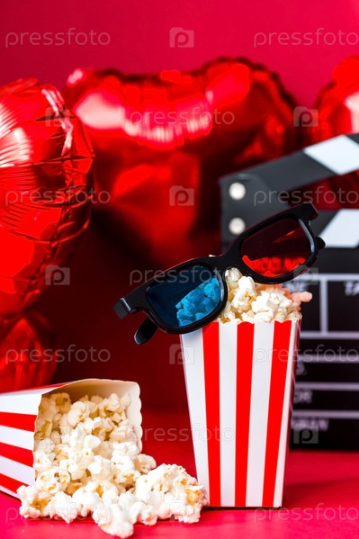 Баннер для киноиндустрии. Романтическое свидание в кино. Кинокамера, 3D-очки, попкорн и фольгированные шары в форме сердца на красном фоне. Премьера фильма состоится в День святого Валентина