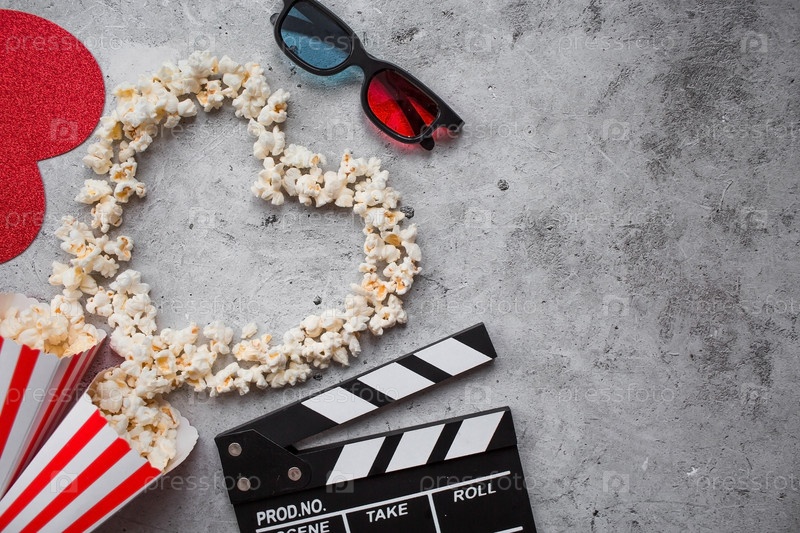 Баннер для киноиндустрии. Романтическое свидание в кино. Кинокамера, 3D-очки, попкорн и сердце из попкорна на стильном бетонно-сером фоне. Премьера фильма состоится в День святого Валентина