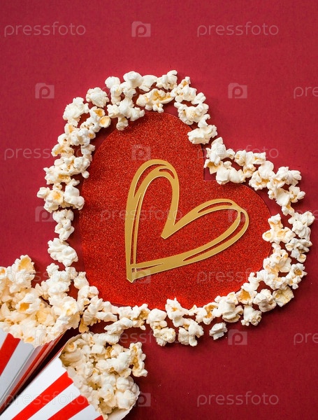Баннер для киноиндустрии. Романтическое свидание в кино. Сердце попкорна и полосатые чашки в стиле ретро на красном фоне. Премьера фильма состоится в День святого Валентина