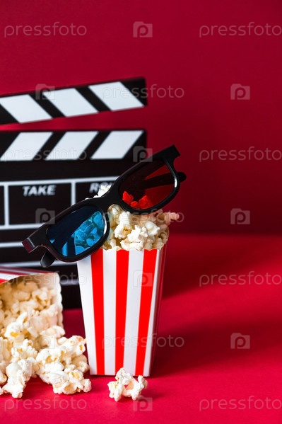 Баннер для киноиндустрии. Романтическое свидание в кино. Кинокамера, 3D-очки, попкорн в полосатых чашках на красном фоне. Премьера фильма