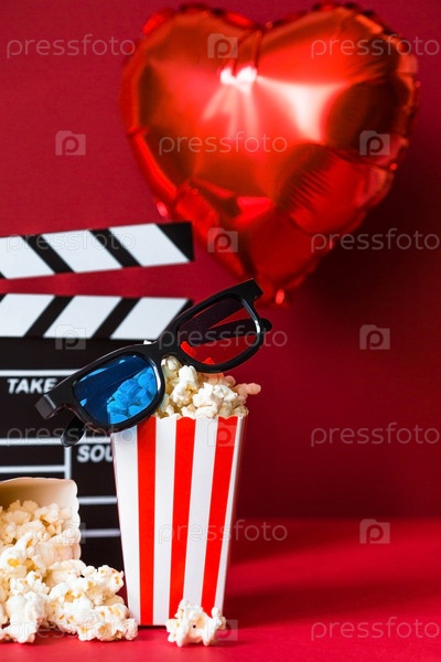 Баннер для киноиндустрии. Романтическое свидание в кино. Кинокамера, 3D-очки, попкорн и фольгированные шары в форме сердца на красном фоне. Премьера фильма состоится в День святого Валентина