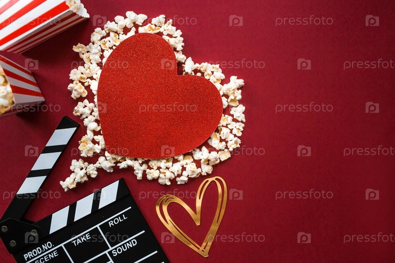 Баннер для киноиндустрии Романтическое свидание в кино. Кинокамера, 3D-очки, попкорн и сердце попкорна на красном фоне Премьера фильма состоится в День святого Валентина