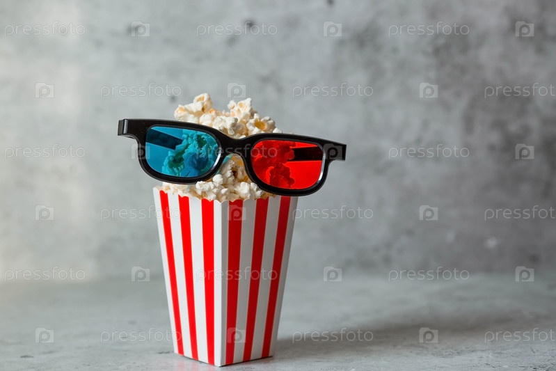 Баннер для киноиндустрии. Дата выхода фильма. 3D-очки и попкорн в полосатых кружках на стильном бетонно-сером фоне. Премьера фильма