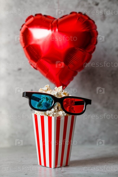 Баннер для киноиндустрии. Романтическое свидание в кино. Кинокамера, 3D-очки, попкорн и фольгированные шары в форме сердечек на бетонно-сером фоне. Премьера фильма состоится в День святого Валентина