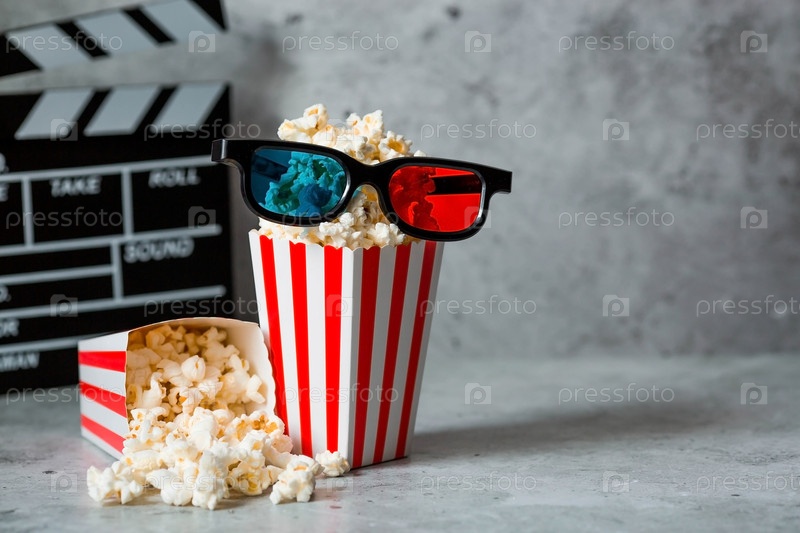 Баннер для киноиндустрии. свидание в кино. кинокамера, 3D-очки, попкорн в полосатых чашках на стильном бетонно-сером фоне. премьера фильма