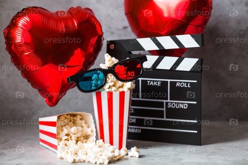 Баннер для киноиндустрии. Романтическое свидание в кино. Кинокамера, 3D-очки, попкорн и фольгированные шары в форме сердечек на бетонно-сером фоне. Премьера фильма состоится в День святого Валентина