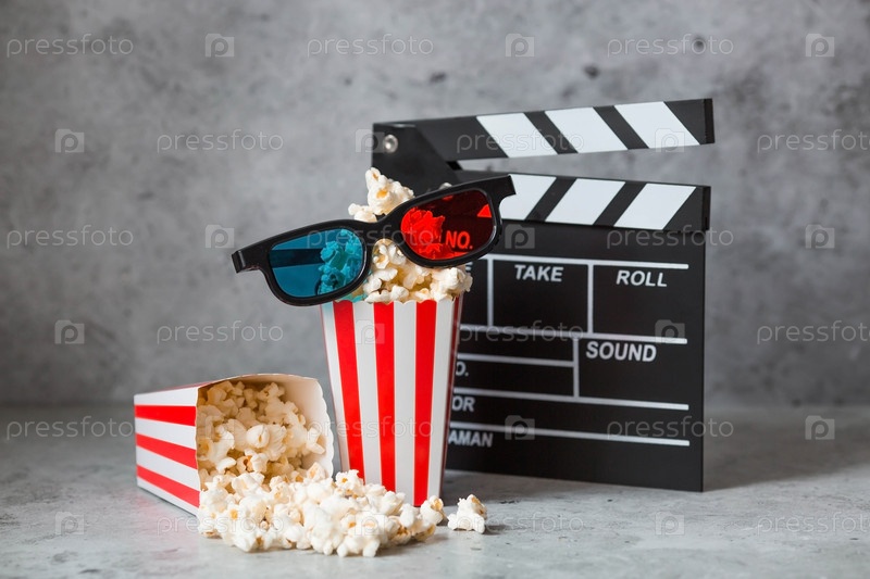 Баннер для киноиндустрии. свидание в кино. кинокамера, 3D-очки, попкорн в полосатых чашках на стильном бетонно-сером фоне. премьера фильма