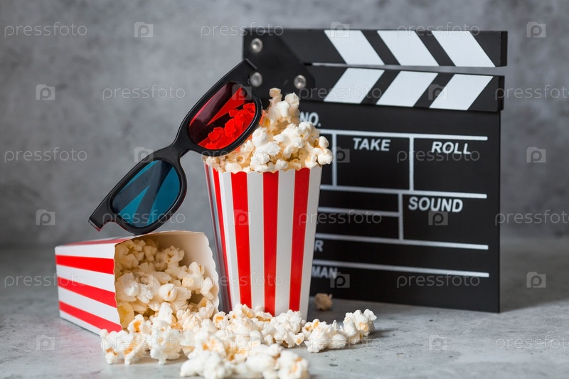 Баннер для киноиндустрии. свидание в кино. кинокамера, 3D-очки, попкорн в полосатых чашках на стильном бетонно-сером фоне. премьера фильма