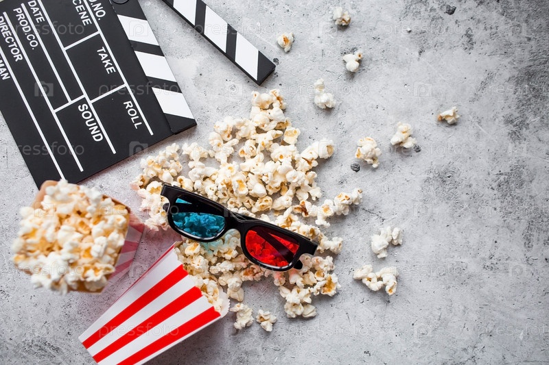 Баннер для киноиндустрии. свидание в кино. кинокамера, 3D-очки, попкорн в полосатых чашках на стильном бетонно-сером фоне. премьера фильма