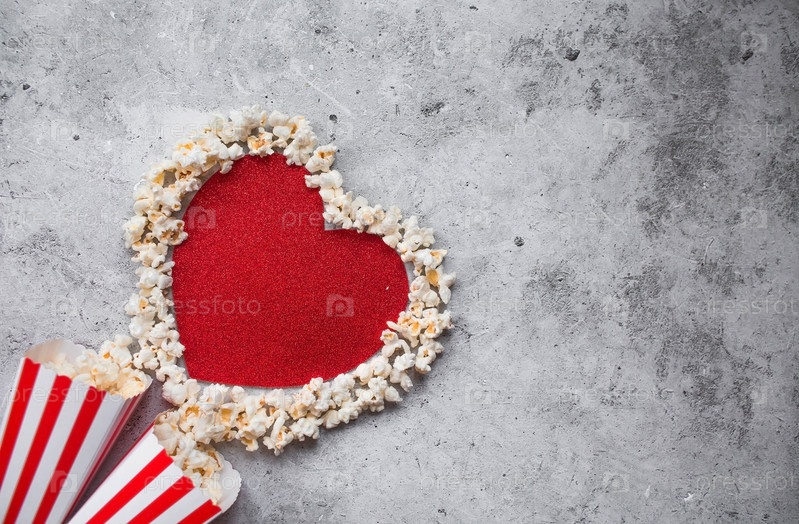Баннер для киноиндустрии. Романтическое свидание в кино. Сердце из попкорна и полосатые чашки в стиле ретро на стильном бетонно-сером фоне. Премьера фильма состоится в День святого Валентина