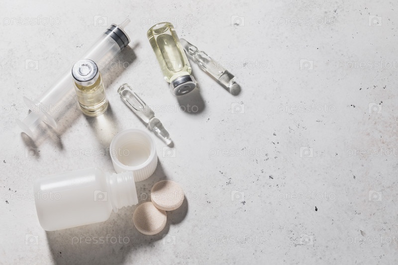 Различные лекарства на столе с местом для копирования на правой стороне кадра