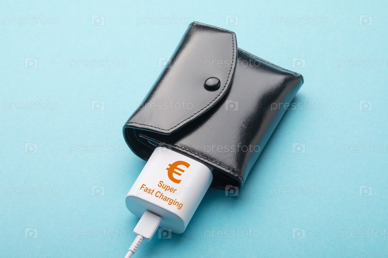 Черный кошелек и зарядное устройство для смартфона на синем фоне, концепция дополнительного дохода
