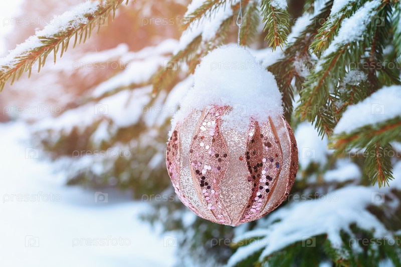Новогодняя игрушка в снегу висит на елке