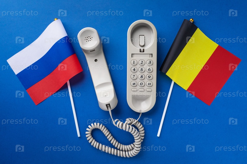 Старый телефон и два флага на синем фоне, концепция на тему телефонных разговоров между Бельгией и Россией